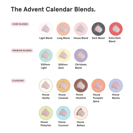 Count down to Christmas with 25 days of home-compostable, Nespresso® compatible pods, each a unique blend of our speciality-grade coffee—we're talking A LOT of different blends, from our signature House Blend to our Extra Dark Blend to our Pumpkin Spice Blend. You won't get bored.
