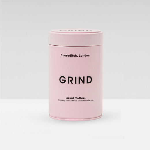 A 227g bag of speciality whole bean or ground coffee roasted by our team in Bermondsey, alongside our classic pink Grind tin. Our pink coffee bags are plastic-free and commercially compostable.