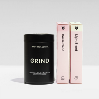 A 227g bag of speciality whole bean or ground coffee roasted by our team in Bermondsey, alongside our sleek black Grind tin. Our pink coffee bags are plastic-free and commercially compostable.