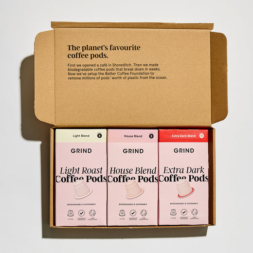 Our biodegradable pods are compatible with your original-style Nespresso® machine or with our very own Grind Coffee Pod Machine.