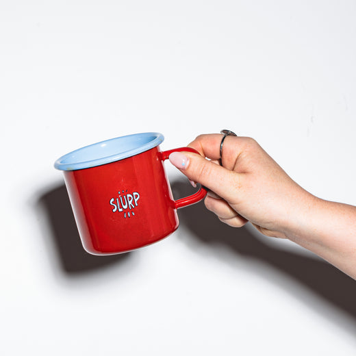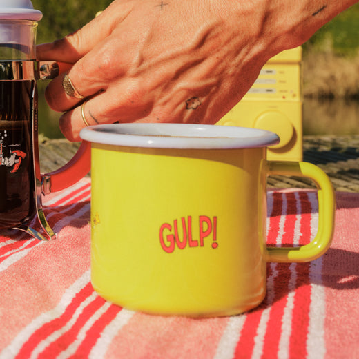 Set of two Grind x Peanuts enamel mugs, one red featuring a napping Snoopy, one yellow with a napping Woodstock.