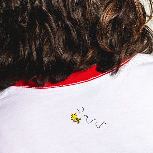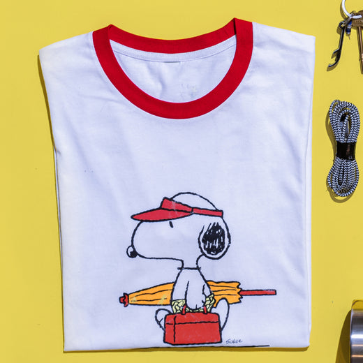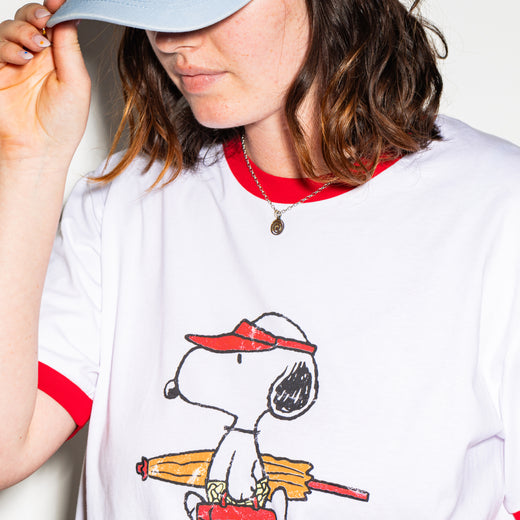 This Grind x Peanuts limited edition short sleeve tee features an illustration of Snoopy off on a summer adventure on the front and Woodstock on the back. Available in unisex sizes S-XXL.