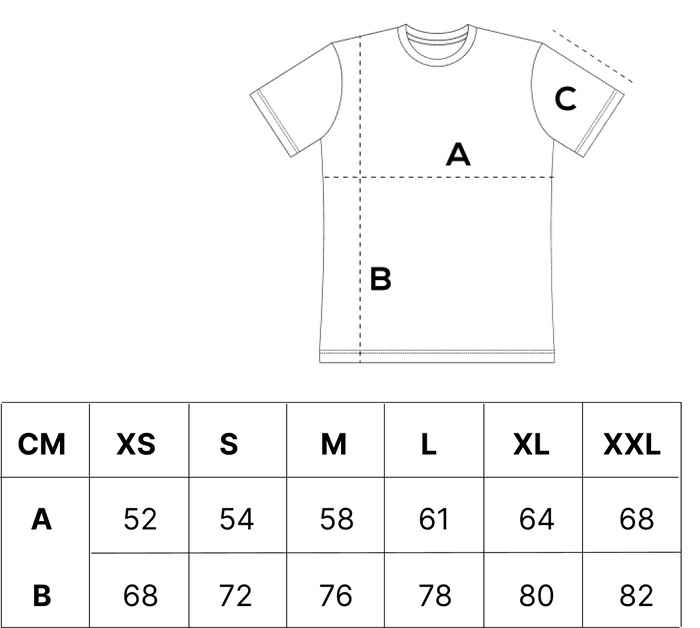 Measurements in cm for unisex sizes XS-XXL are as below: