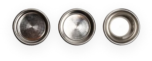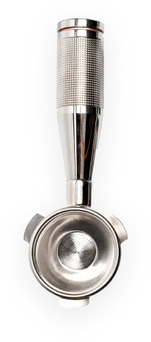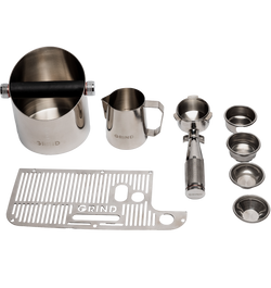 Premium bespoke accessories, including a polished stainless steel portafilter, knock box, and milk jug.