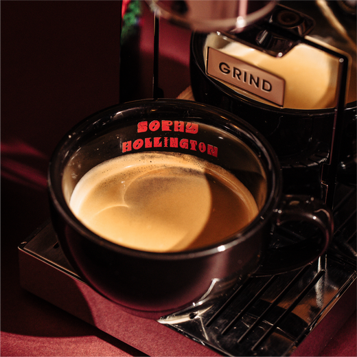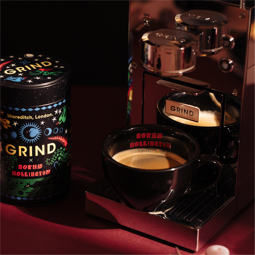 And these coffee cups are pretty magical: they're the same ones we use in all our cafés, designed so you can bring the Grind experience home with you. One cup features Sophy Hollington's iconic moon phase illustration, one features her red trademark.