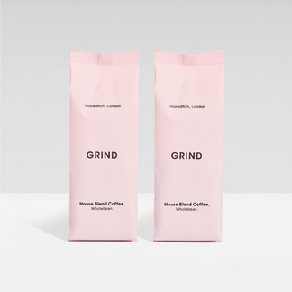 Makes four extra-large ice cubes, each featuring the Grind logo.