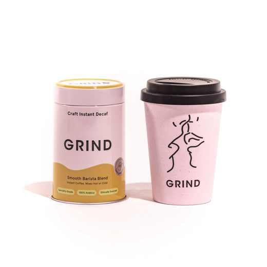 Your on-the-go bundle: a 90g tin of speciality-grade decaf instant coffee with our signature reusable coffee cup.
